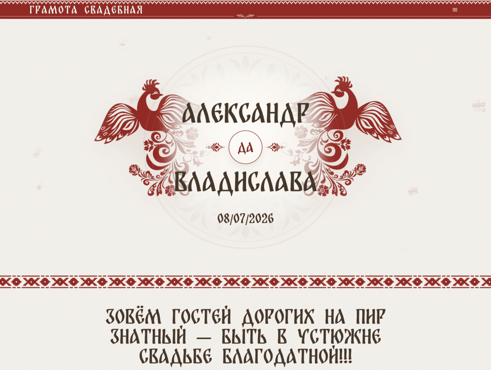 Подходит, если нужен готовый свадебный сайт с быстрым запуском, понятной структурой и адаптацией под вашу свадьбу.